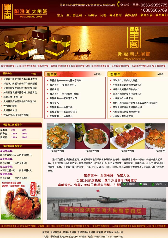 晉城陽澄湖大閘蟹-蟹王閣專賣店,提供正宗陽澄湖大閘蟹和大閘蟹禮券,我們應對您不同的需求為您訂制了各種價位的大閘蟹券和包裝精美的大閘蟹禮盒。咨詢熱線:18303565769 網(wǎng)址http://www.jcsdzx.com |